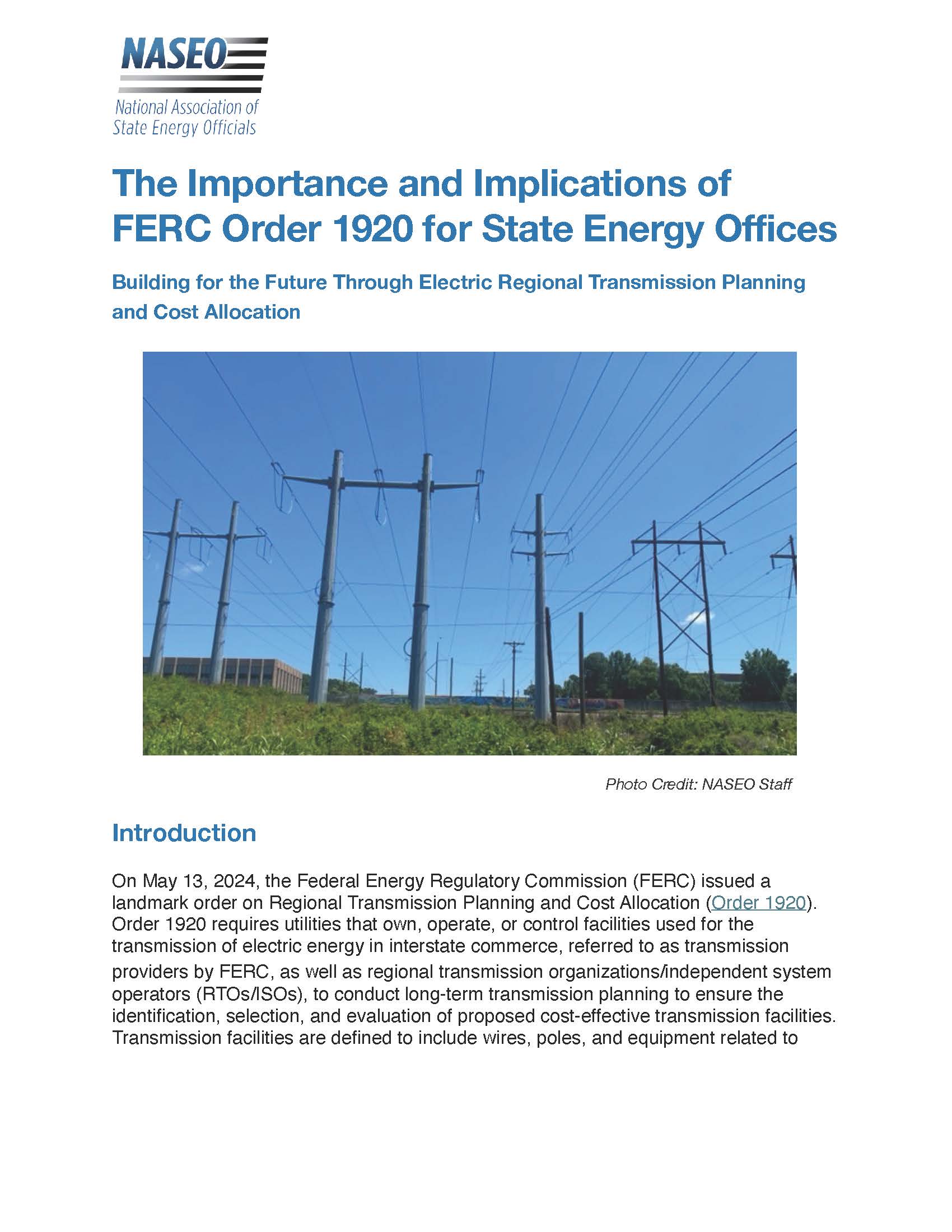 On September 26, 2024, NASEO released a new publication, The Importance and Implications of FERC Order 1920 for State Energy Offices: Building for the Future Through Electric Regional Transmission Planning and Cost Allocation. The report describes the roles of State Energy Offices in transmission planning and cost allocation in the wake of the Federal Energy Regulatory Commission (FERC) Order 1920. Through a question-and-answer format, the report summarizes and highlights significant implications of Order 1920 for State Energy Offices, and includes an overview of the order, as well as outlines its implementation timeline, next steps, and the role of State Energy Offices. Please click here for the full report.